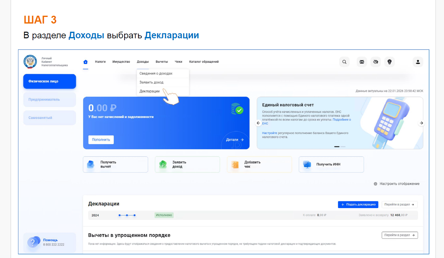 Ссылка на информационные материалы, пошаговые инструкции, в том числе и видеоматериалы, как последовательно можно заполнить деклорацию в ЛК ФЛ самостоятельно: https://disk.yandex.ru/d/2XSKPpTFxtC8DQ